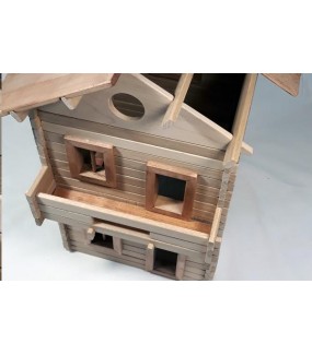 Dieses besondere Modell eines Hauses aus Holzbohlen mit Satteldach wurde zu 100 % aus natürlichem polnischem Laubholz – Buche, Eiche und Erle – gefertigt und mit einem ökologischen, sicheren Wachs behandelt.
