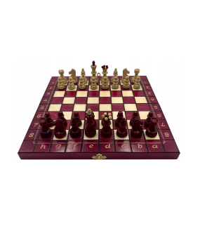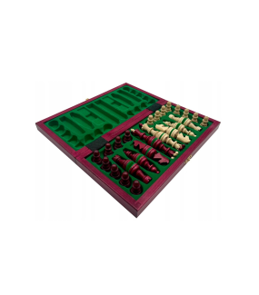 Das Schachbrett besteht aus Lindenholz und Sperrholz, ist fein gebacken, gebeizt und lackiert. Die Innenseite ist mit einem grünen Einsatz ausgekleidet.